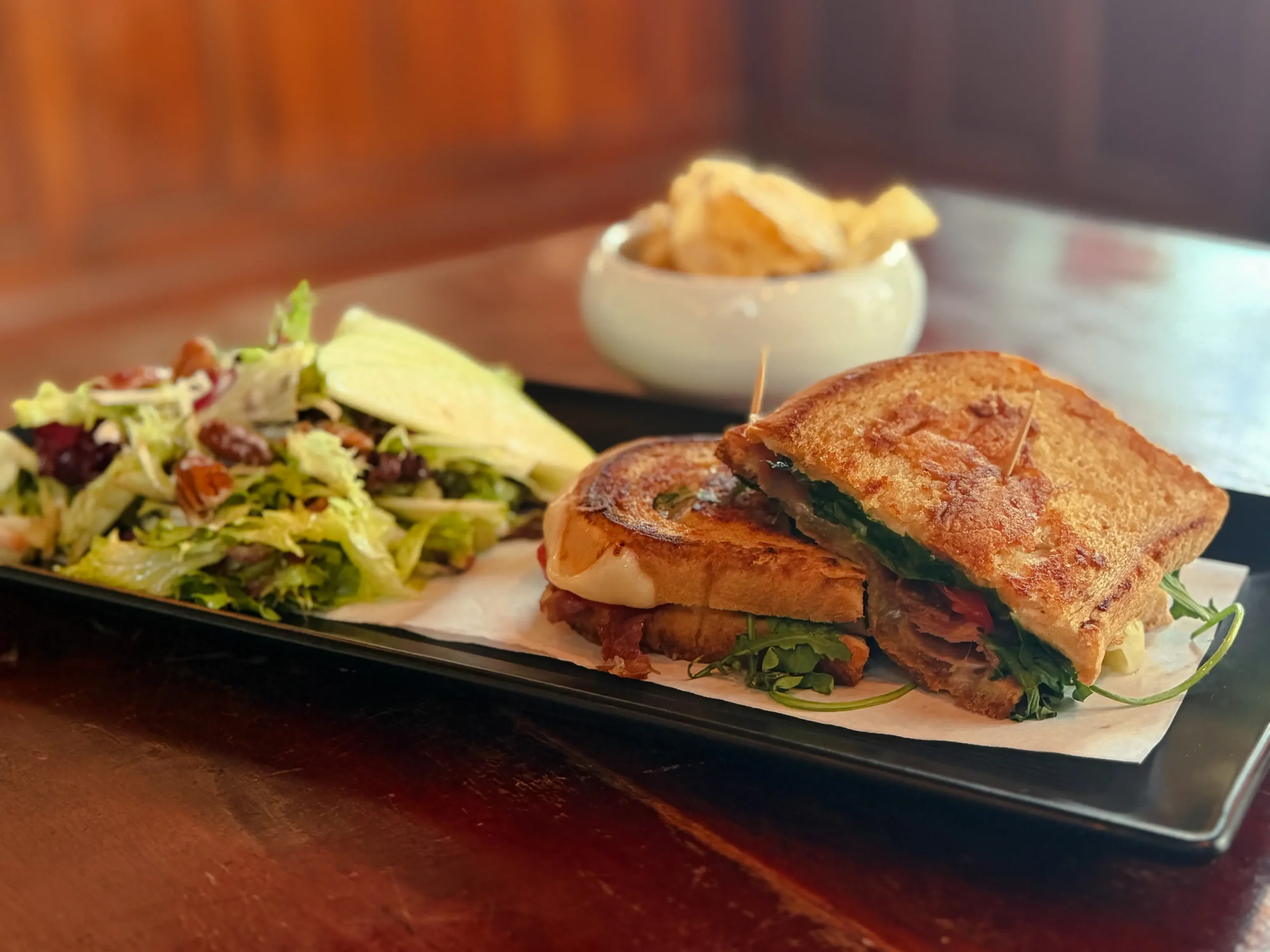 Prosciutto, Parmesan, Fontina, and Mozzarella Cheese Topped with Arugula on Sourdough Bread. Served with Kettle Chips and a Choice of Side Salad